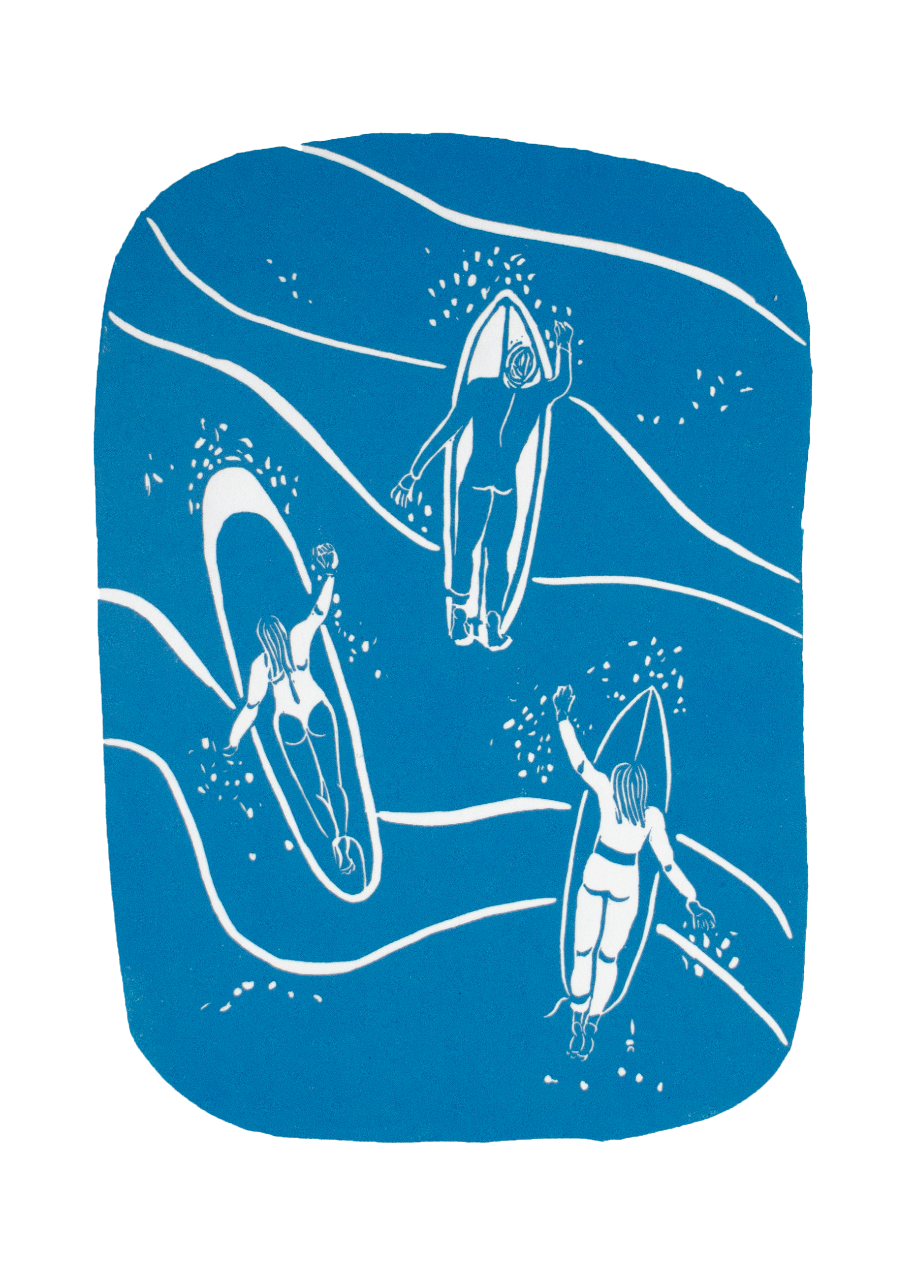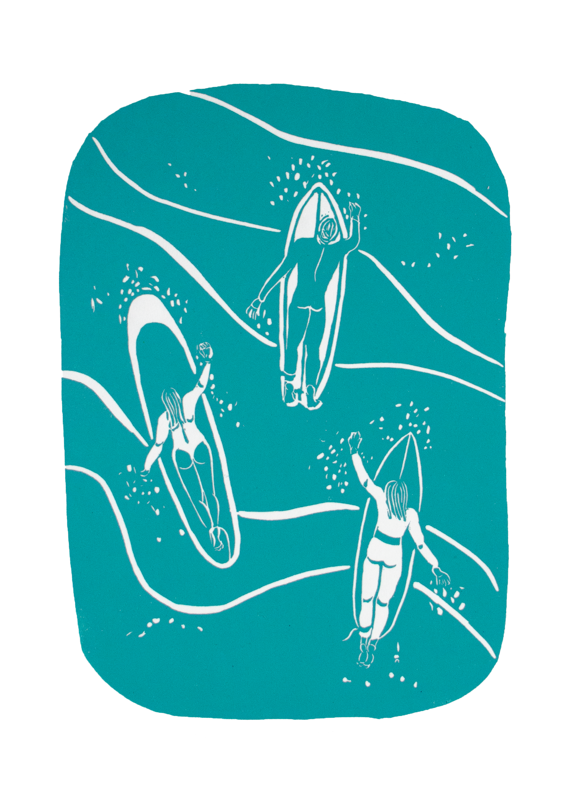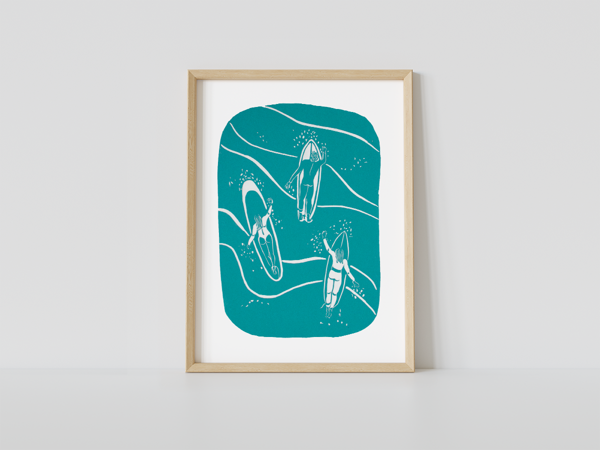 Currumbin on kuvaus lempeästä surffikohteesta Australian Queenslandissä. Alkuperäinen, käsinvedostettu taidegrafiikkaprintti, vedostettuna 80g/m japaninpaperille. Turkoosin sävy vaihtelee.