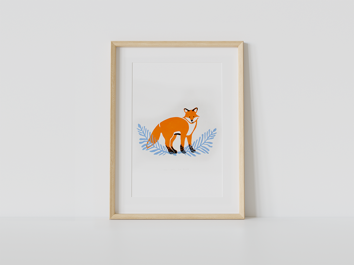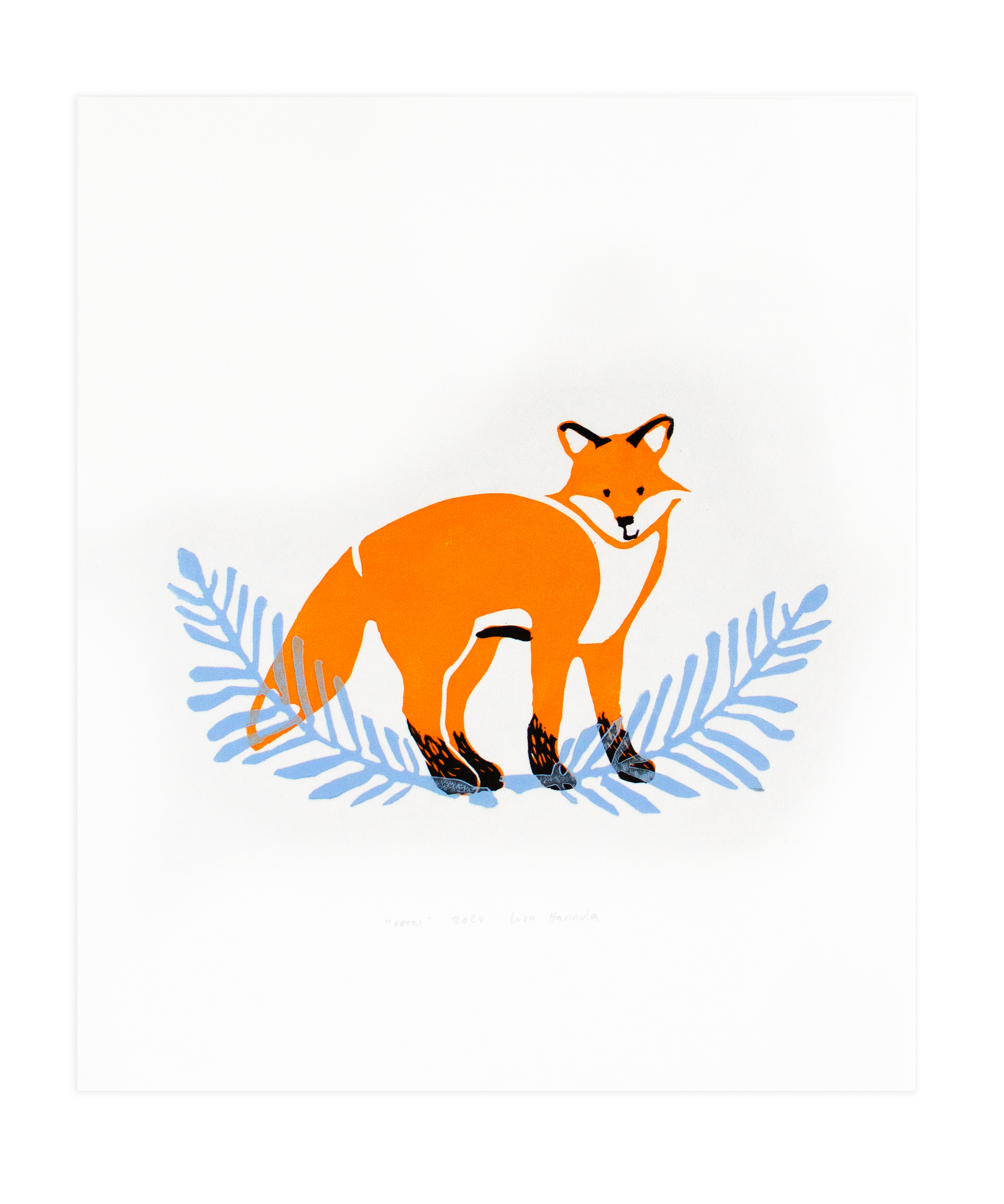 Kaikille tuttu metsiemme kettu. Alkuperäinen, käsinvedostettu taidegrafiikkaprintti, vedostettuna 80g/m japaninpaperille.